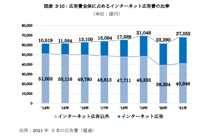 (引用:令和3年度電子商取引に関する市場調査報告書「図表 3-10:広告費全体に占めるインターネット広告費の比率」)