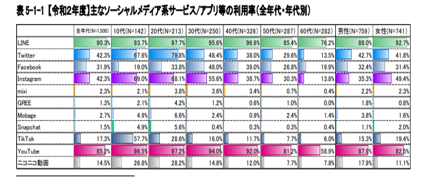 - 「Twitter」「TikTok」:10代、20代の若い層が多く利用している
